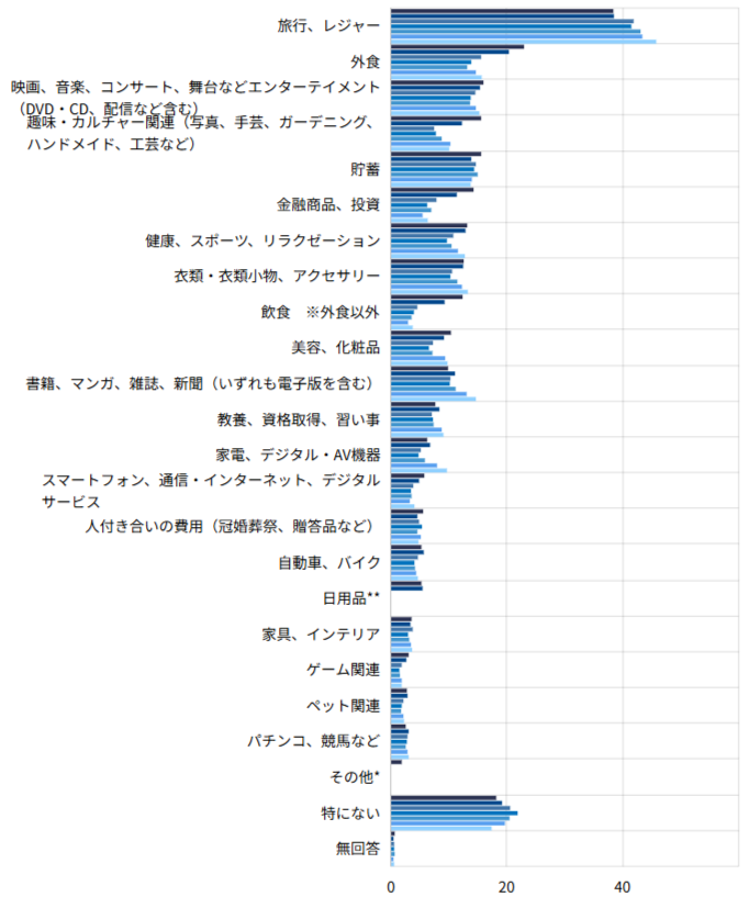 では、消費者は自由に使えるお金を何に使っているのであろうか?それを確認するために、同調査から、自由に使えるお金の使用目的をまとめたものが図3である。その結果からは、自由に使えるお金の実際の使途では「外食」(46.1%)が最多で、次いで「飲食(外食以外)」「衣類・アクセサリー」が30%台で続いていることがわかる。また、経年変化を見てみると、「飲食(外食以外)」の比率が上昇し、「旅行、レジャー」「書籍、マンガなど」の比率が減少していることも見て取れる。さらに、「外食」についても、今回の結果はコロナからの回復もあって、前回よりは上昇しているものの、緩やかな減少傾向が見られる。これは、旅行やレジャー、外食など外的な贅沢を控えつつ家庭内の飲食など日常の中で満足度を高める節約型満足消費へのシフトが進んでいることを示唆しており、留意すべき点である。